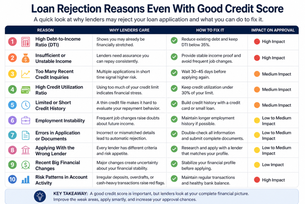 You can get rejected for a loan even with a good credit score because lenders evaluate multiple factors beyond your score, including: